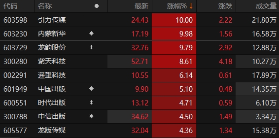12月14日早盘,申万一级行业板块中,传媒板块走高。截至9时41分,引力传媒、内蒙新华涨停。龙韵股份接近涨停,紫天科技涨超8%,遥望科技涨逾6%,中国出版、时代出版、中信出版等跟涨。