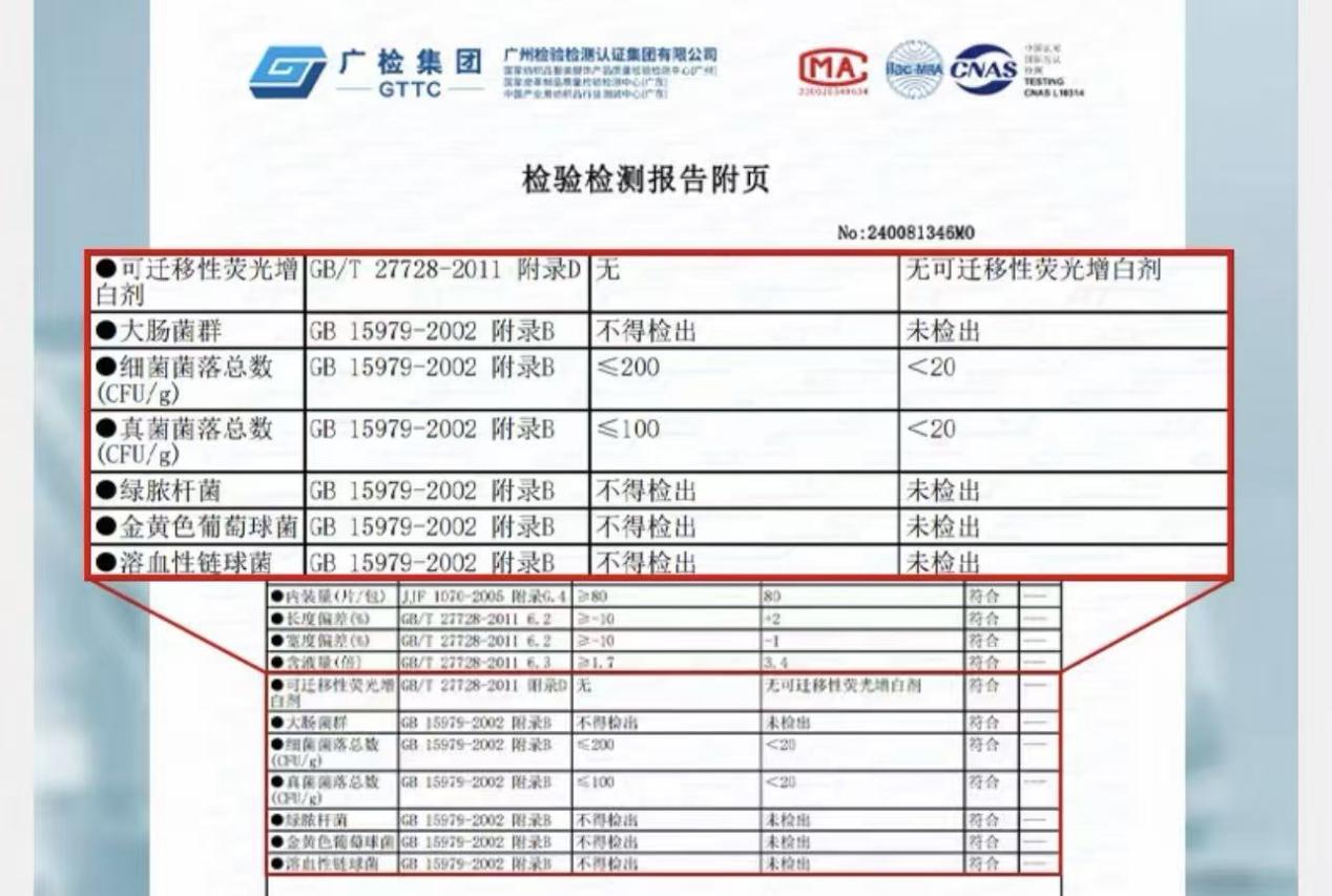 从监测结果来看,行业整体呈现“良莠不齐”的态势。基础指标方面,所有样品包装密封性能全部合格,长度、宽度偏差及含液量均符合国标要求,未出现外观破损、异物污渍等问题,但有3款产品存在内装量短缺问题,其中一款100片/包的样品实际仅72片;卫生指标方面,所有样品均未检出大肠菌群、铜绿假单胞菌等致病菌,细菌菌落总数、真菌菌落总数及可迁移性荧光物质均符合国标限值。