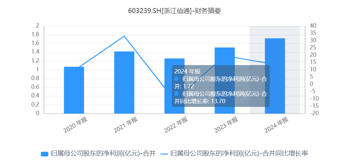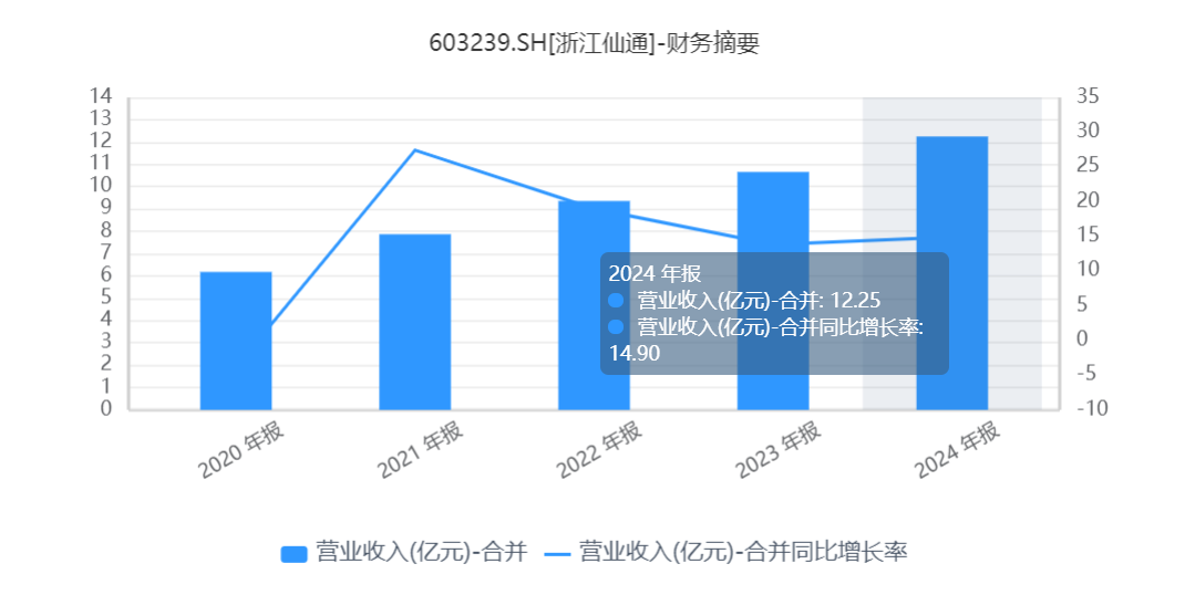 2024年,浙江仙通实现营业收入12.25亿元,同比增长14.90%;净利润1.72亿元,同比增长13.70%,双双创历史新高。良好的增长势头延续到了今年上半年,公司实现营业收入6.72亿元,同比增长21.1%;归母净利润1.07亿元,同比增长17.1%。