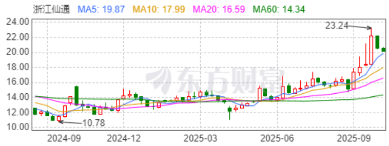 二级市场上,浙江仙通表现颇为亮眼,一度触及23.24元/股高点,距离一年前10.78元/股的低点,已经成功翻倍。