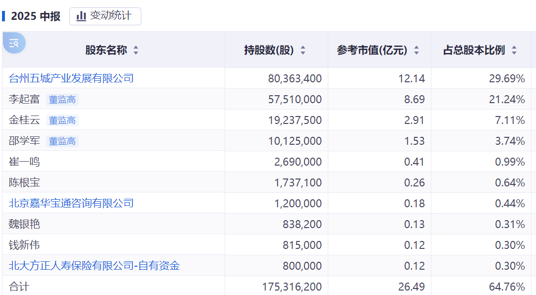2024年12月,公司控股股东台州五城基于对公司未来发展前景的信心及中长期价值的认可,开展了未来12个月内的增持计划。截至2025年6月底,台州五城累计增持1,613,400股股份,目前持有上市公司80,363,400股股份,占总股本的比例为29.69%。
