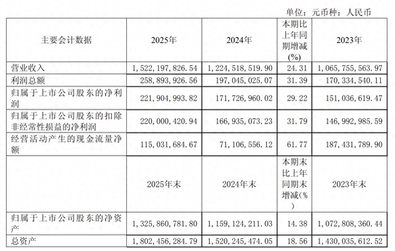 2025年,浙江仙通实现营业收入15.22亿元,同比增长24.31%;归属于上市公司股东的净利润2.22亿元,同比增长29.22%;归属于上市公司股东的扣除非经常性损益的净利润2.20亿元,同比增长31.79%。
