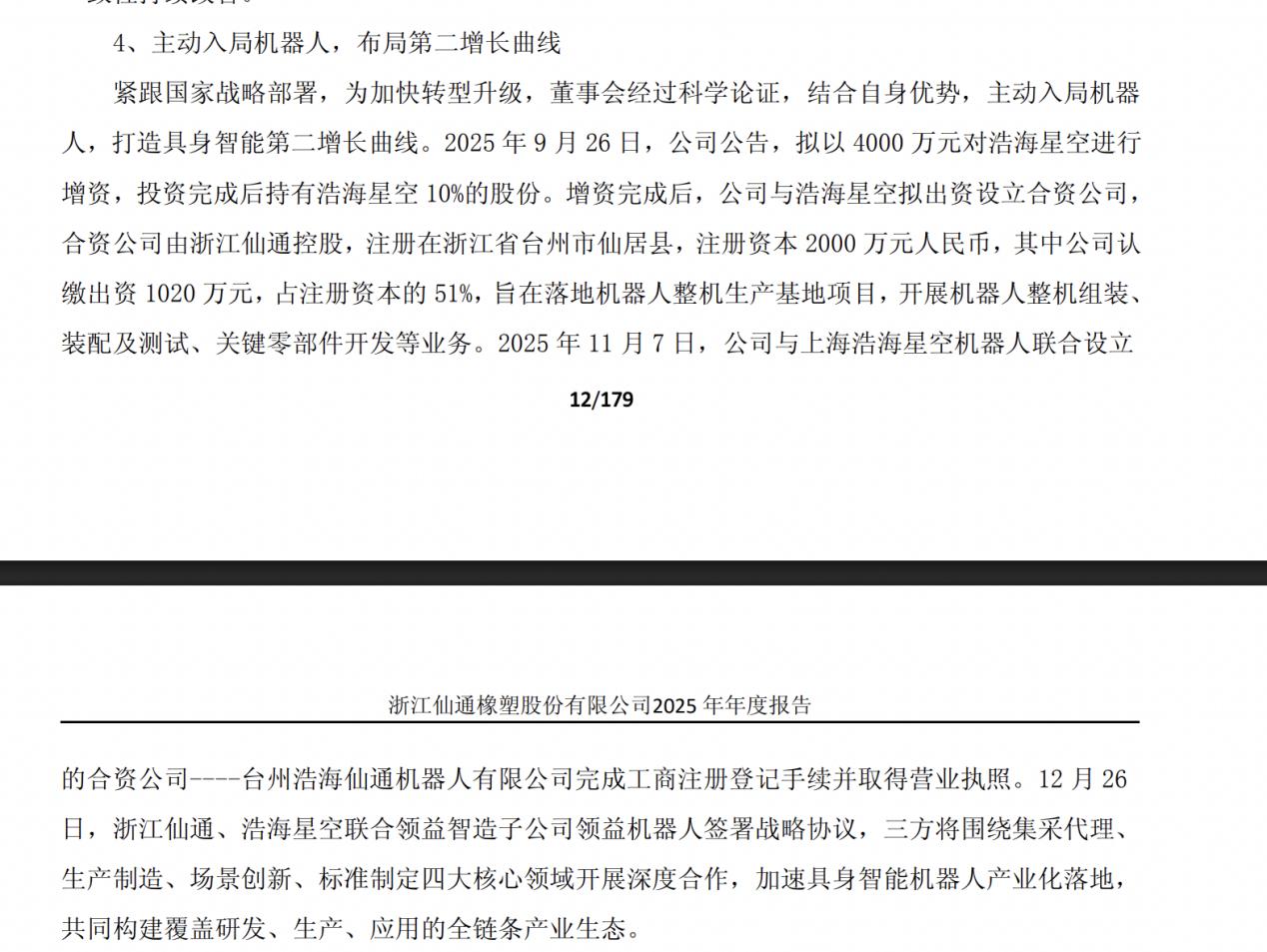 2025年9月26日,公司公告,拟以4000万元对浩海星空进行增资,投资完成后持有浩海星空10%的股份。增资完成后,公司与浩海星空拟出资设立合资公司,合资公司由浙江仙通控股,旨在落地机器人整机生产基地项目,开展机器人整机组装、装配及测试、关键零部件开发等业务。2025年11月7日,合资公司完成工商注册登记手续并取得营业执照。