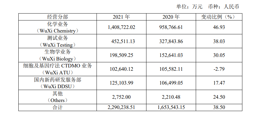 图为药明康德2021年五大业务板块营收情况(来源:药明康德年报)