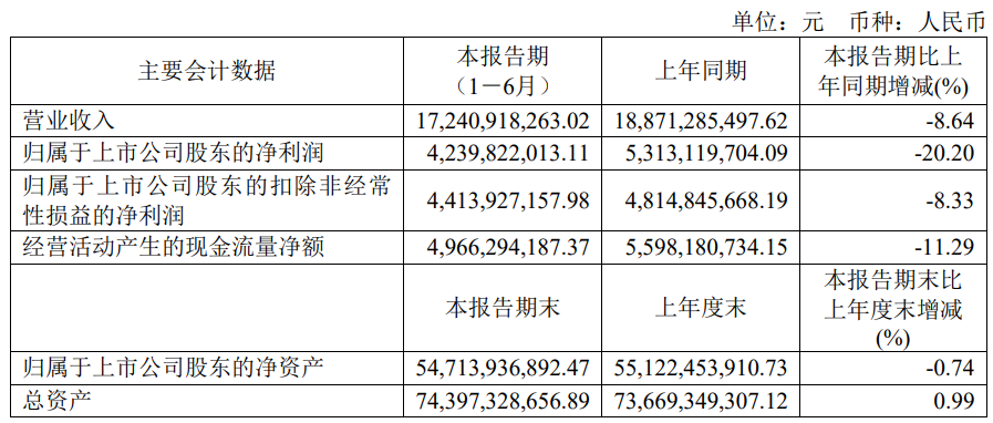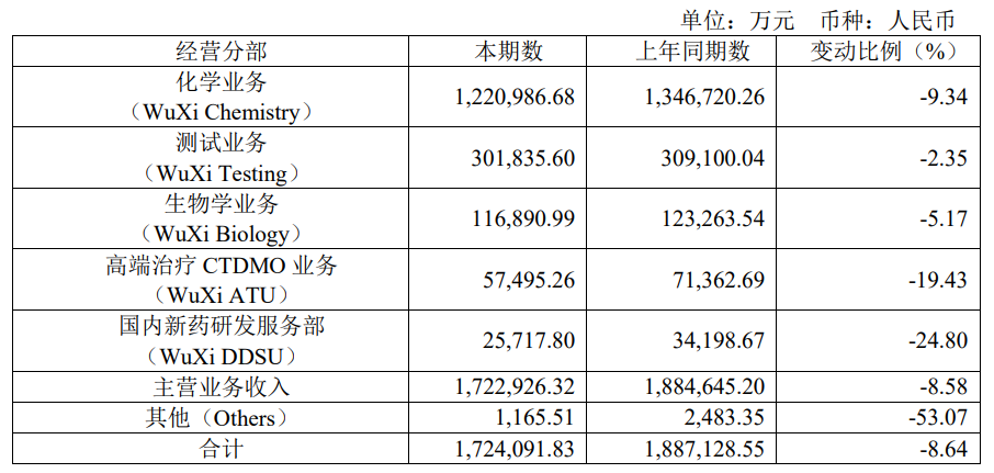报告显示实现营收172.41亿元,同比下降8.64%,归母净利润42.40亿元,同比下降20.20%。这也是过去5年来,药明康德首次录得半年报业绩下滑。