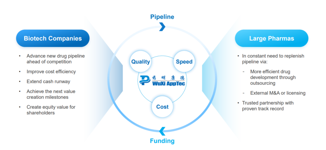 但在Biotech兴起的初期,许多CXO仍然更倾向于服务大药企。早在多年前,药明康德提出“长尾战略”,一句广为流传的口号是,希望在不远的将来“一个人,一个想法,一张纸,一支笔,一张信用卡,在药明康德的赋能平台上就能进行新药研发。”