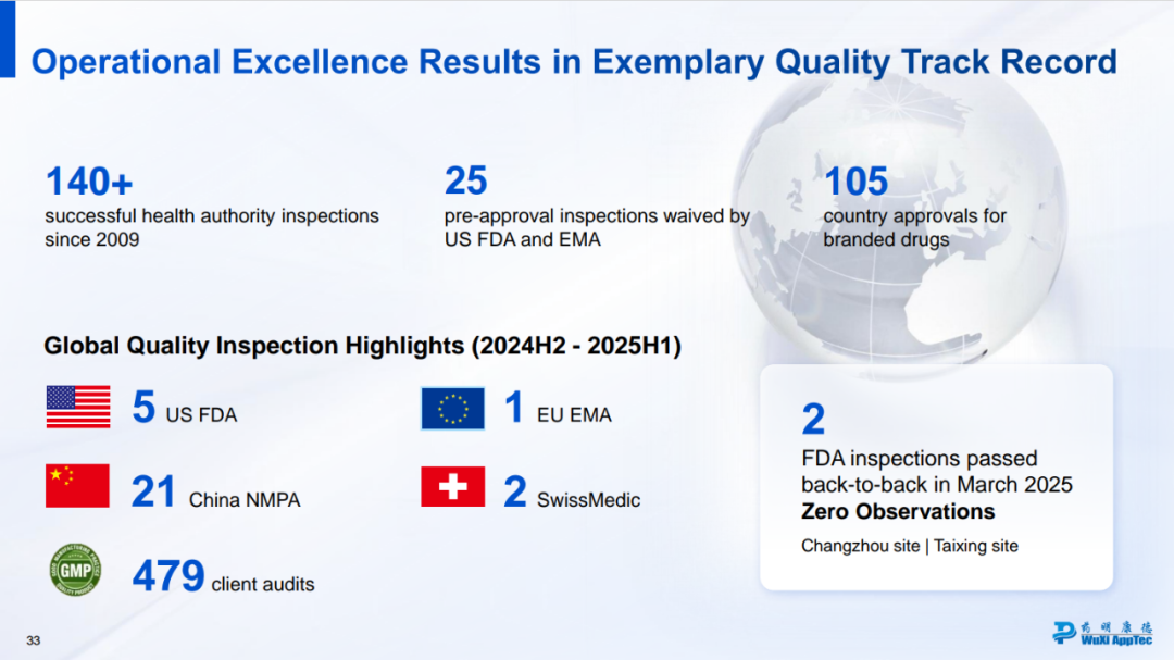 当然,这个案例只是药明康德质量体系获认可的一个缩影。2009年以来,药明康德化学业务平台成功通过全球监管机构的审计超过140次。得益于出色的质量记录,25次新药审批前审计得到美国FDA和EMA豁免。药明康德严格的质量管理不仅提升了客户信任度,也为公司在全球市场中树立了良好的声誉,赢得更多合作机遇。