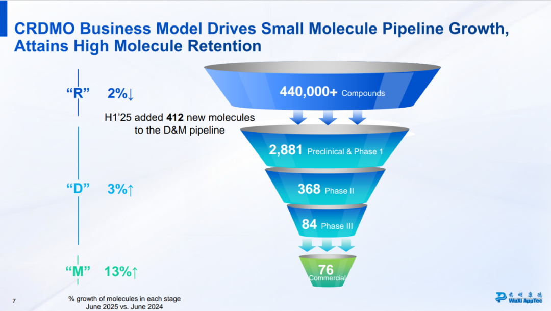 R端的多重优势,为下游D&M端的高效转化奠定了基础。2025年上半年,药明康德小分子管线内R端向D&M端转化了412个分子,D&M端管线总数超过3400个,包括76个商业化项目。与2018年相比,如今药明康德CRDMO平台用2倍的R端订单增长,撬动了17倍的D&M订单增长。