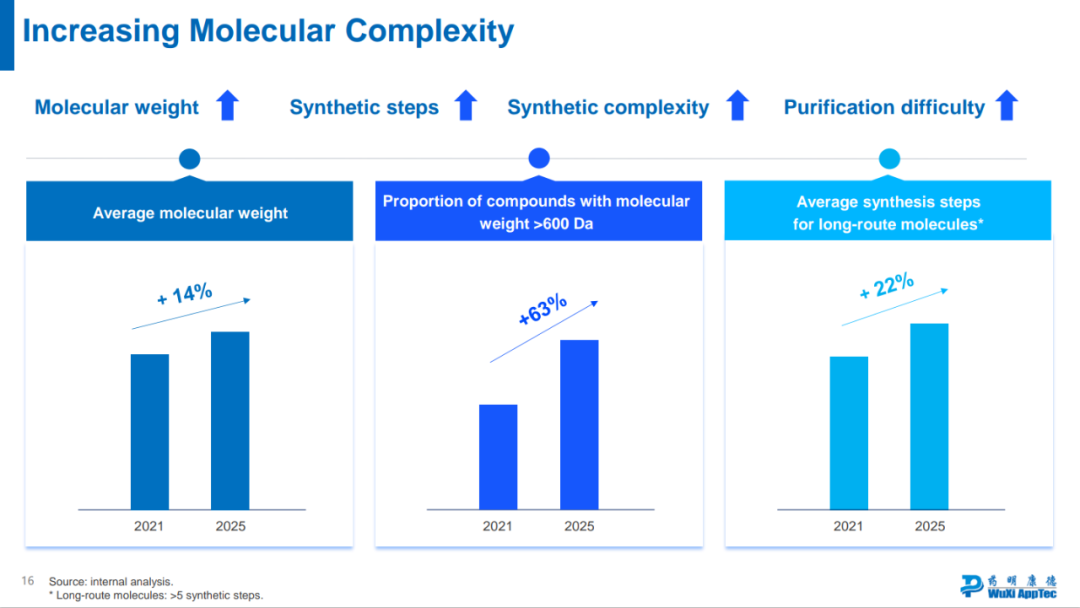 需求增加的同时,CXO企业所承接的研发项目,技术难度也同步攀升。如今,新型合成分子的结构愈加复杂,据药明康德研发化学团队统计,仅仅在过去5年中,合成的平均分子量就增长了14%,平均合成步骤增长22%;与此同时,一系列新分子类型为曾经“不可成药”的靶点带来创新疗法。