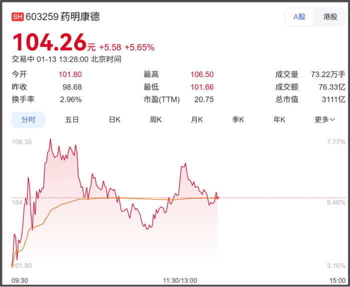2025年业绩预增公告发布后,1月13日药明康德A股股价开盘后即高开高走。截止发稿,该公司股价为104.26港元,涨幅5.65%,总市值3111亿元。