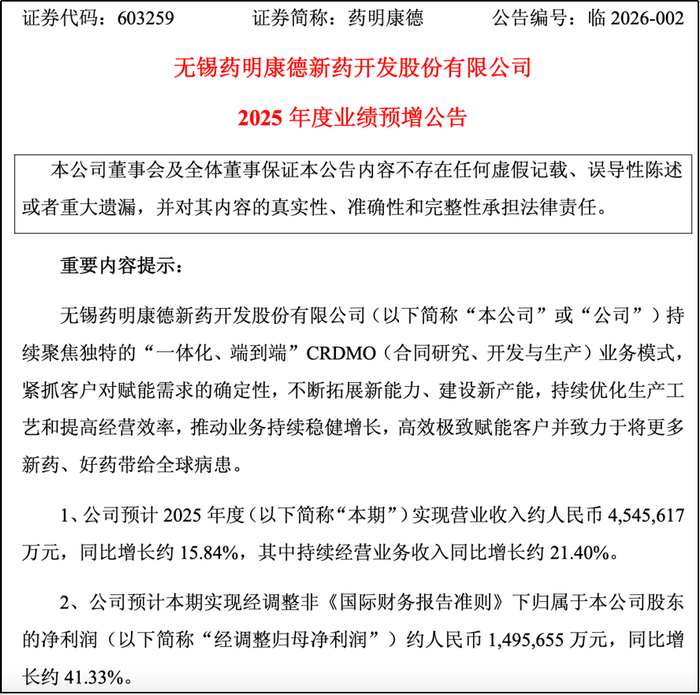 《星岛》了解到,药明康德预计,2025年全年实现的总营业收入约为454.56亿元,同比增长约15.84%,其中持续经营业务收入同比增长约 21.40%。