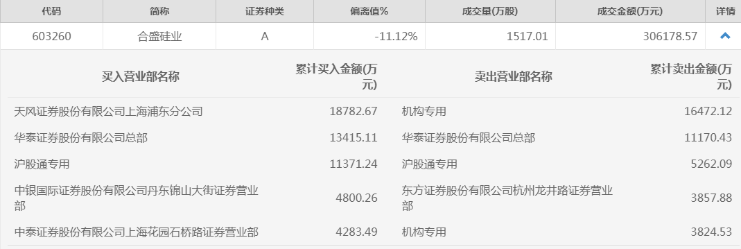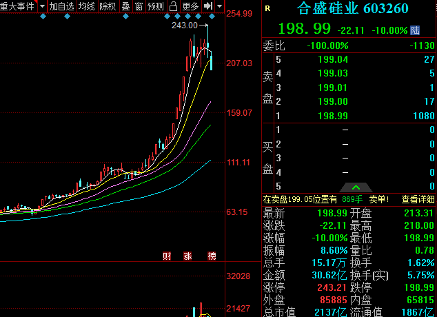 合盛硅业开盘不到20分钟即封死跌停,截至收盘,股价报198.99元,全天成交额超30亿元,总市值2137亿元。