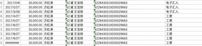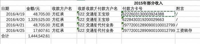 例如,方红承2015年的部分收入,即系由王宝珍个人名下银行卡,(卡号为6228430319200029663、6222603130003924388)发放。