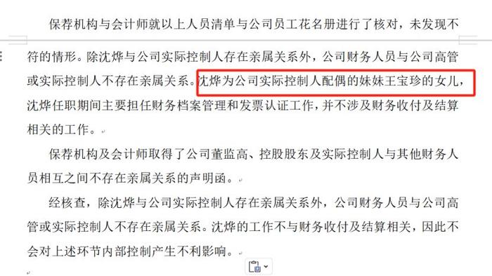 证监会早已关注到此问题,在2017年6月的《反馈意见》第75条当中,“请保荐机构核实公司财务部负责人、会计出纳等是否与高管尤其是实际控制人存在亲属关系,如有,请披露,并请会计师核查上述情况是否对财务收付、结算等内部控制产生不利影响。”
