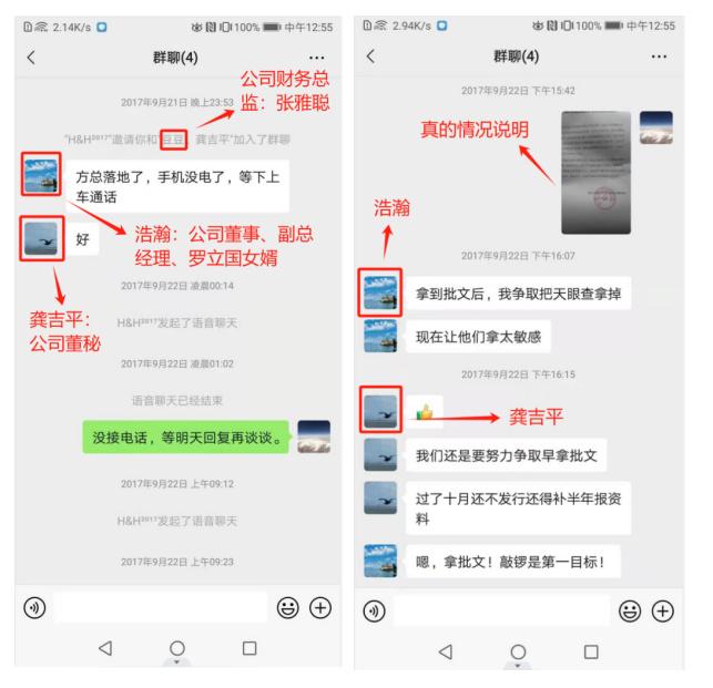 根据微信聊天记录显示,2017年9月21日晚,罗立国的女婿浩瀚建了一个微信群,除浩瀚本人外,该微信群还有方红承、龚吉平(董秘)、张雅聪(财务总监)三人。四人先就合盛硅业被税务处罚、需要撤销该处罚的事宜进行了语音电话沟通。之后,方红承将真的情况说明发在了在该微信群里,浩瀚却赤裸裸地表示,待上市批文拿到之后,其即会通过某种方式、将收录的税务部门对合盛公司的税务处罚记录“拿掉”,并称“现在让他们拿太敏感”,充分说明浩瀚本人对存在真实的税务处罚记录心知肚明,也明知使用伪造的情况说明的行为系瞒天过海。