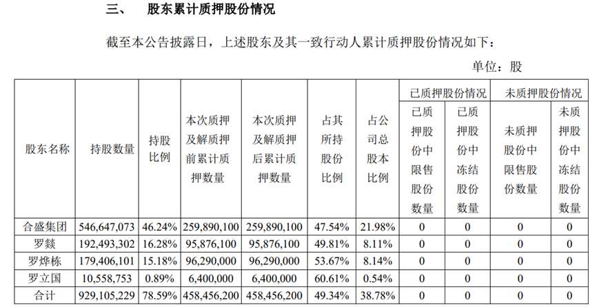 为了支撑大规模的投资与扩张,自2023年以来,罗立国家族多次通过定增、担保、股权质押等方式筹集资金。最新的关于控股股东部分股份质押及解质押的公告披露,截至2月17日,罗立国家族已将其持有的49.34%的合盛硅业股份质押,占公司总股本的38.78%。