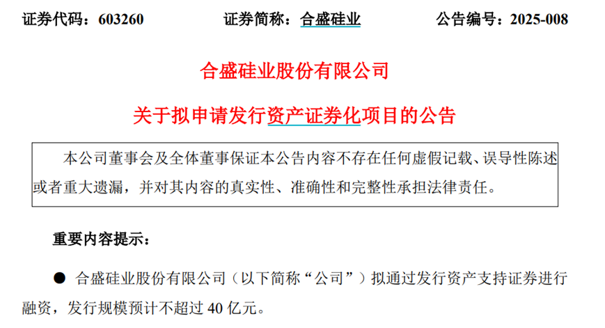 2月11日晚间,合盛硅业发布公告称,为拓宽公司融资渠道,加速资金周转,公司拟申请发行资产证券化项目(以下简称“ABS项目”),总发行额度不高于40亿元。