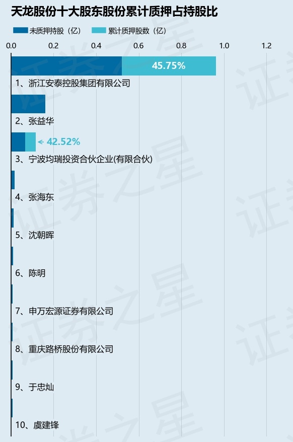 截止本公告日,股东浙江安泰控股集团有限公司已累计质押股份4400.0万股,占其持股总数的45.75%,股东宁波均瑞投资合伙企业(有限合伙)已累计质押股份500.0万股,占其持股总数的42.52%。本次质押后天龙股份十大股东的累计质押股份占持股比例见下图: