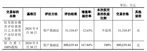 根据辽宁众华出具的《置出资产评估报告》,以2024年9月30日为评估基准日,本次交易拟置出资产评估值为51,310.47万元。经交易各方友好协商,以上述评估值为基础,本次重组拟置出资产交易价格为51,310.47万元。根据华亚正信出具的《置入资产评估报告》,以2024年9月30日为评估基准日,本次交易拟置入资产评估值为800,639.44万元。经交易各方友好协商,以上述评估值为基础,本次重组拟置入资产恒力重工100%股权的交易价格为800,639.44万元。