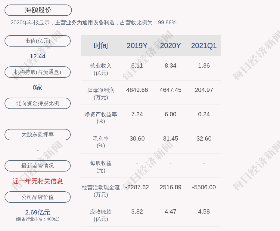 2020年年报显示,海鸥股份的主营业务为通用设备制造,占营收比例为:99.86%。
