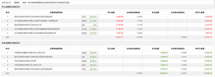具体来看,中国国际金融上海分公司、国元证券佛山季华五路证券营业部分别卖出5696.92万元、3589.85万元;国信证券深圳泰然九路证券营业部、东方财富证券拉萨东环路第二证券营业部分别买入2492.69万元、2234.92万元。