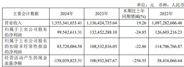 据公司2024年年报,报告期内,公司实现营业收入13.55亿元,同比增长19.26%;归属于上市公司股东的净利润9954.26万元,同比减少24.85%;扣除非经常性损益后的净利润8372.01万元,同比减少22.86%,经营活动产生的现金流量净额-1.58亿元,同比减少256.55%。