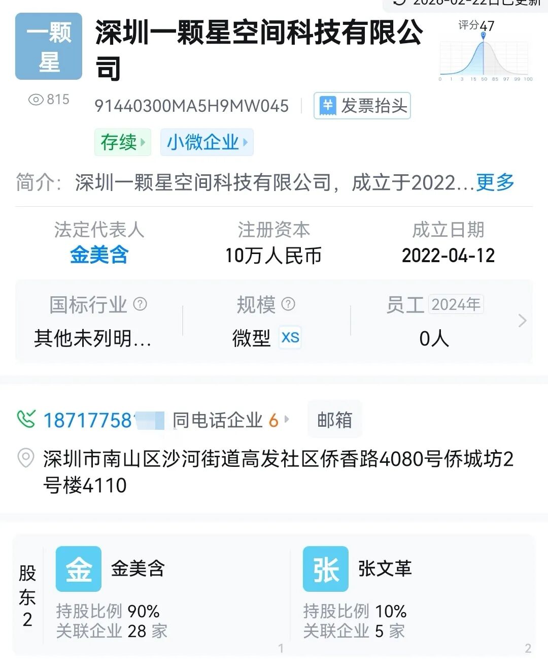 在天眼查上,我们搜索“金美含”,发现有深圳公司【深圳一颗星空间科技有限公司】的股东是金美含,且,公司注册地址为深圳市南山区沙河街道高发社区侨香路4080号侨城坊2号楼4110。