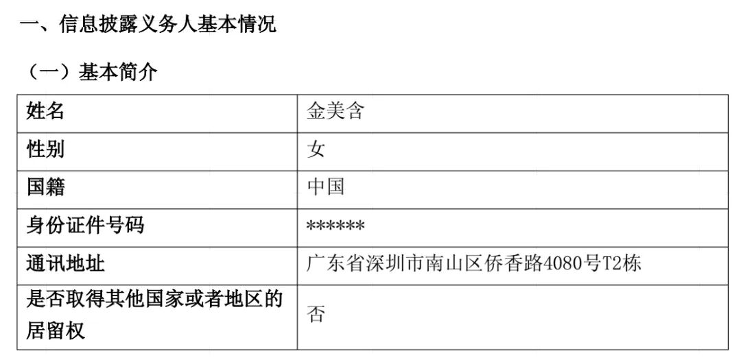 上市公司披露的金美含信息非常少,我们通过简式权益变动报告书只能知道金美含是一位女士,通讯地址深圳南山区乔香路4080号T2栋。