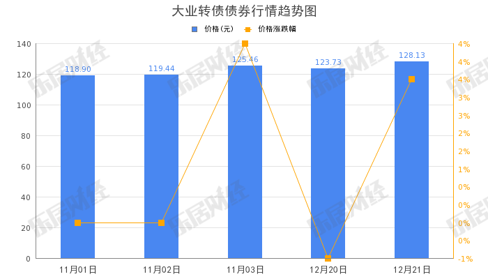 乐居财经 12月22日,“大业转债”(113535)早盘拉高,截至11:10,涨幅10.83%,报142.01元。总成交量46.99万手,成交额6.59亿元。