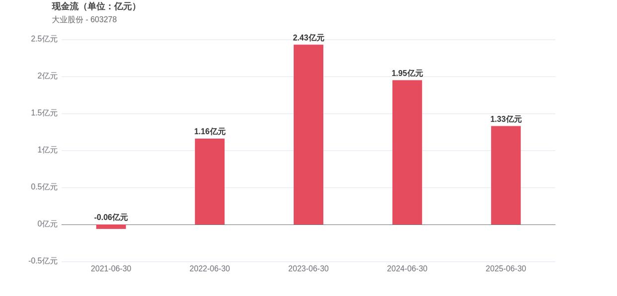 在经营稳健性方面,大业股份面临资产负债率攀升的压力,存货周转天数为55.65天,较2024年上半年下降了2.5%,表明存货管理效率有所提升。经营活动产生的现金流净额为1.33亿元,相比2024年同期的1.95亿元,同比下滑了0.63%。此外,2025年上半年的资产负债率为74.88%,同比增长了7.89个百分点,这意味着公司债务负担有所加重。