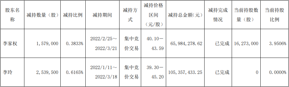 截至2022年4月10日,李家权通过集中竞价方式减持公司股份157.90万股,减持比例为0.3833%,减持价格区间为40.10元/股至43.59元/股,减持总金额为6598.43万元。李玲通过集中竞价方式减持公司股份253.95万股,减持比例为0.6165%,减持价格区间为39.30元/股至45.20元/股,减持总金额为1.05亿元。截至2022年4月10日,本次股份减持时间区间届满,李家权及其一致行动人李玲共计减持公司股份411.85万股,减持比例为0.9998%,减持总金额合计1.71亿元。