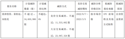 昨日晚间,景津装备(证券代码:603279)发布公告称,因自身资金需求,公司控股股东景津投资有限公司(以下简称“景津投资”)、姜桂廷、宋桂花拟通过集中竞价、大宗交易方式合计减持其所持有的公司股份不超过34,600,986股,即不超过公司总股本的6%,减持价格将按照减持实际实施时的市场价格确定。其中,通过集中竞价交易方式减持的,减持期间为自本减持计划公告之日起15个交易日后的6个月内;通过大宗交易方式减持的,减持期间为自本减持计划公告之日起3个交易日后的6个月内。