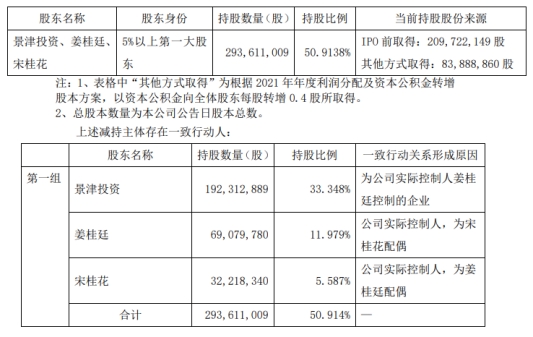 截至公告披露日,景津装备控股股东景津投资持有公司股份192,312,889股,持股比例为33.3481%。实际控制人、董事长、总经理姜桂廷持有公司股份69,079,780股,持股比例11.9788%。实际控制人宋桂花持有公司股份32,218,340股,持股比例5.5868%。公司股东景津投资、姜桂廷、宋桂花合计持有公司股份293,611,009股,持股比例50.9138%。上述股份来源于首次公开发行前持有的股份及公司发行上市后以资本公积金转增股本方式取得的股份,均为无限售条件流通股。