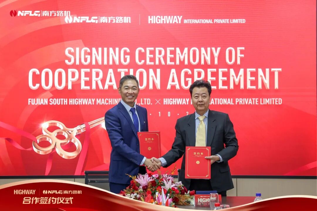 南方路机副董事长兼总经理方凯先生(左)与Highway国际董事长黄渱予先生(右)签约仪式