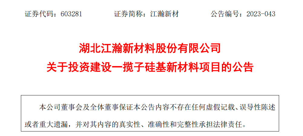 8月21日,江瀚新材发布关于投资建设一揽子硅基新材料项目的公告,拟投资10亿元,项目全部建成后将形成3万吨/年功能性硅烷产品及配套原料与中间体的新增产能。