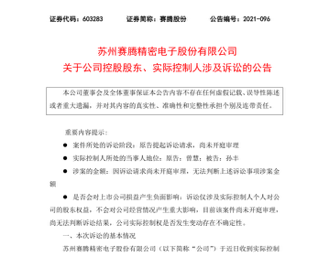 12月16日,赛腾股份公告,公司于近日收到实际控制人孙丰、曾慧通知,得知孙丰近日收到《苏州市吴中区人民法院传票》、《苏州市吴中区人民法院应诉通知书》,曾慧近日收到《苏州市吴中区人民法院受理案件通知书》((2021)苏0506民初12252号),曾慧女士作为原告,孙丰先生为被告,向吴中区人民法院提起诉讼,请求判令离婚并进行财产分割。