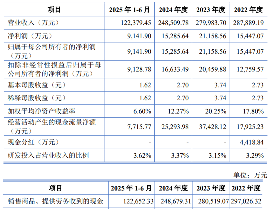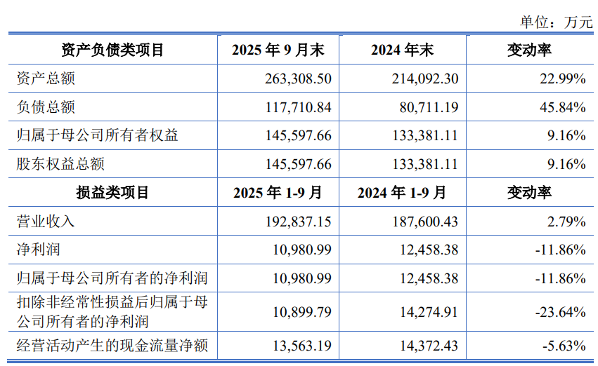 2025年1-9月,公司营业收入192,837.15万元,同比增长2.79%;净利润/归属于母公司所有者的净利润10,980.99万元,同比下降11.86%;扣除非经常性损益后归属于母公司所有者的净利润为10,899.79万元,同比下降23.64%;经营活动产生的现金流量净额为13,563.19万元,同比下降5.63%。
