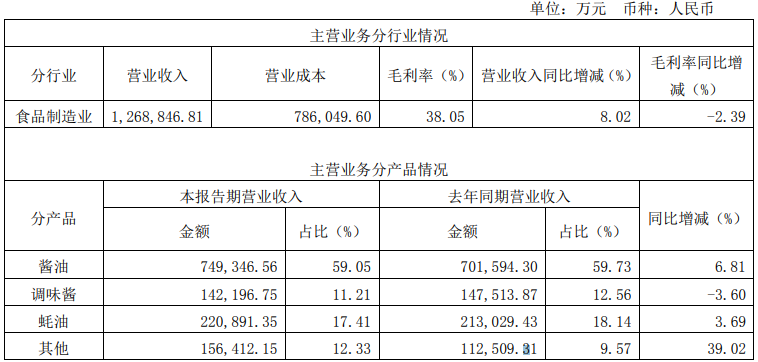 2022上半年,海天味业其他业务实现营收为15.64亿元,同比增长39.02%,占公司总营收仅有12.33%。