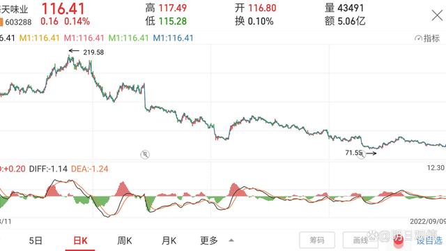 这是海天味业近两年价格走势图,从图上我们看出,价格从21年1月份开始,价格从最高点一路下跌到现在。