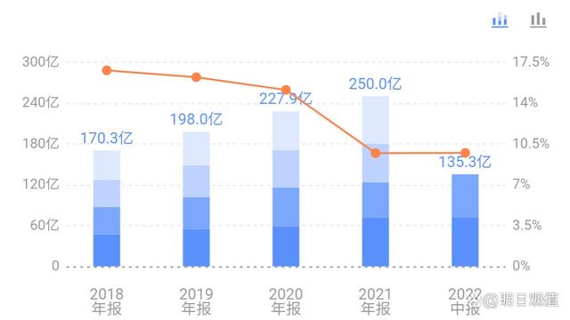 我们看到从2018年开始,营业总收入从170亿一直持续增长到2021年的250亿。