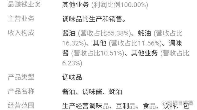 它的主营业务是调味品的生产和销售。其中酱油占营收的大头百分之五十五,耗油占的比重百分之十六,调味酱占到了百分之十。