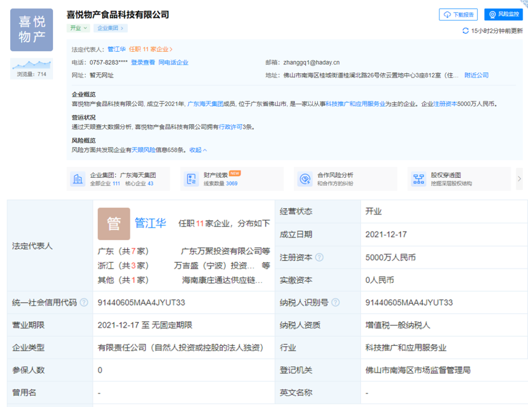 据天眼查显示,推出这两款新品的喜悦物产食品科技有限公司成立于2021年,由佛山市海天调味食品股份有限公司100%控股投资,法人为海天味业副总裁、财务负责人管江华,经营范围包括食品销售、农产品的生产、销售等。