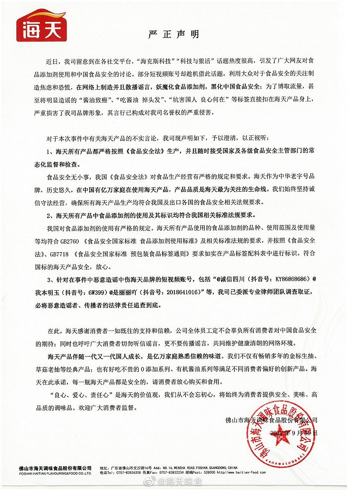 9月30日晚间,海天味业官微发布声明称,海天所有产品都严格按照《食品安全法》生产,并且随时接受国家及各级食品安全主管部门的常态化监督和检查;海天所有产品中食品添加剂的使用及其标识均符合我国相关标准法规要求。针对在事件中恶意造谣中伤海天品牌的短视频账号,公司已委派专业律师团队调查取证,必将恶意造谣者、传播者的法律责任追查到底。