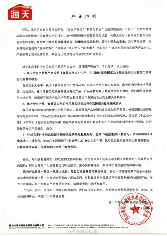 在声明中,海天味业表示,部分短视频账号利用大众对于食品安全的关注制造焦虑和恐慌,在网络上制造并且散播谣言,严重损害了公司品牌形象,其言行己构成对公司名誉权的严重侵害。