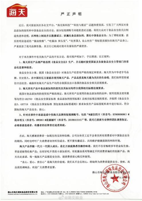 声明还表示,针对在事件中恶意造谣中伤海天品牌的短视频账号,海天味业已委派专业律师团队调查取证,必将恶意造谣者、传播者的法律责任追查到底。