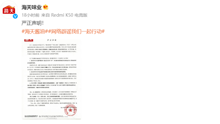 9月30日晚间,海天味业官方微博发布一则声明,对近期产品添加剂争议进行回应。在声明中,海天味业表示,海天所有产品都严格按照《食品安全法》生产,并且随时接受国家及各级食品安全主管部门的常态化监督和检查;海天所有产品中食品添加剂的使用及其标识均符合我国相关标准法规要求。
