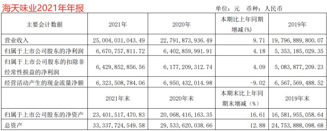 据《电鳗财经》观察,海天味业近年来保持着持续增长,营业收入、净利润、扣非净利润等主要指标可谓芝麻开花节节高。其中,2021年该公司实现营业收入250.04亿元,同比增长9.71%;归属于上市公司股东的净利润66.71亿元,同比增长4.18%。