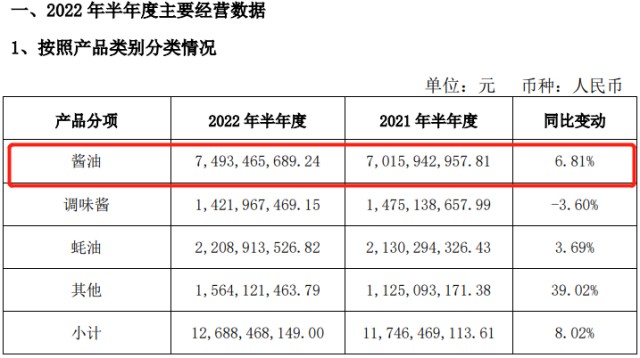 据海天味业披露的主要经营数据,按产品分类,该公司2022年上半年实现产品收入126.88亿元,其中酱油产品收入74.93亿元,占比59.06%。此外,今年上半年海天味业的调味酱产品收入占比11.21%,蚝油产品占比17.41%。其他产品增长是最猛的,上半年增长了39.02%,包括醋、鸡精、味精、料酒等调味品。