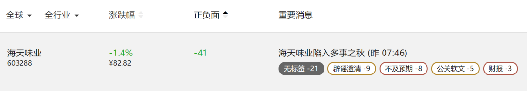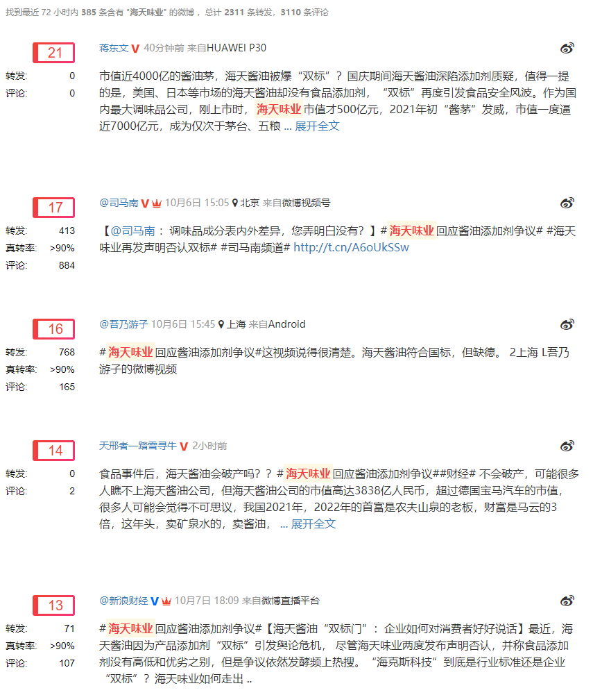 最新情况:妖妖灵监测到,在社交媒体平台,关于海天味业的相关话题热度仍旧不低。全行业来看,截至10月9日晚间,海天味业的舆情热力值排在首位。