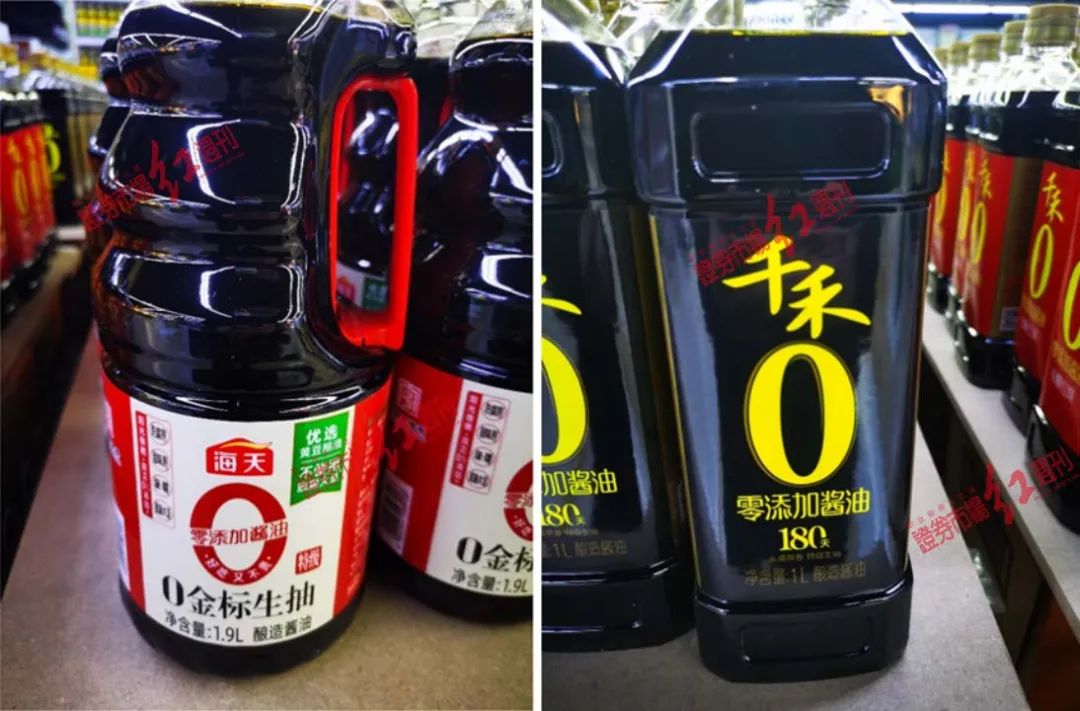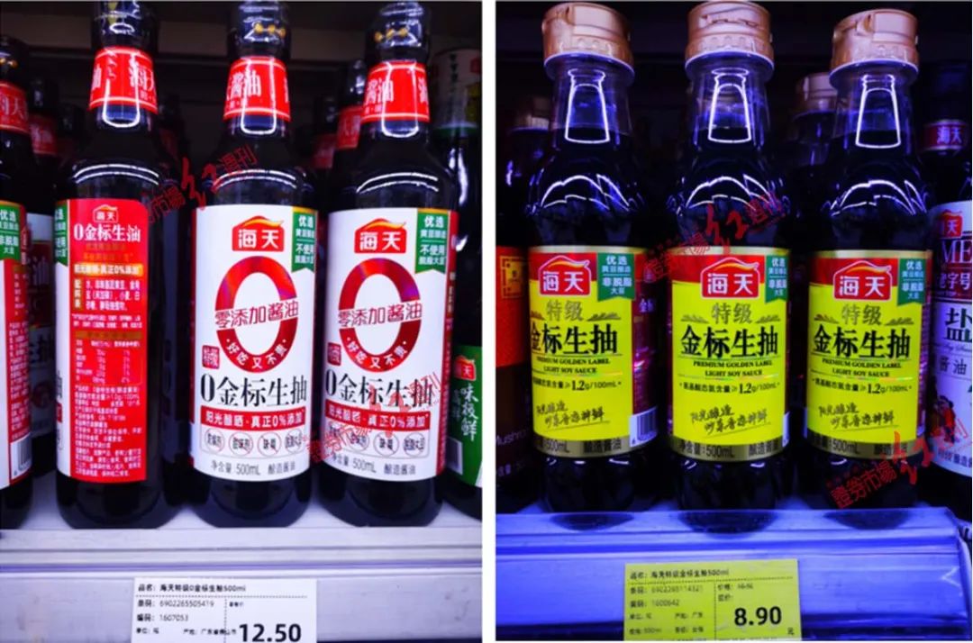 此外,《红周刊》走访后发现,“零添加”正在成为各大商超力推的主标签。除上述京客隆超市打折售卖海天0金标生抽外,另一家大型商超同时将海天0金标生抽以及千和零添加酱油两款产品放在了促销柜台(非普通货架)上。但“零添加”的价格明显高于“非零添加”的,如一款500ml的海天零添加酱油,该超市零售价为12.5元/瓶,而另一款500ml同为海天的非零添加的酱油价格为 8.9元/瓶。